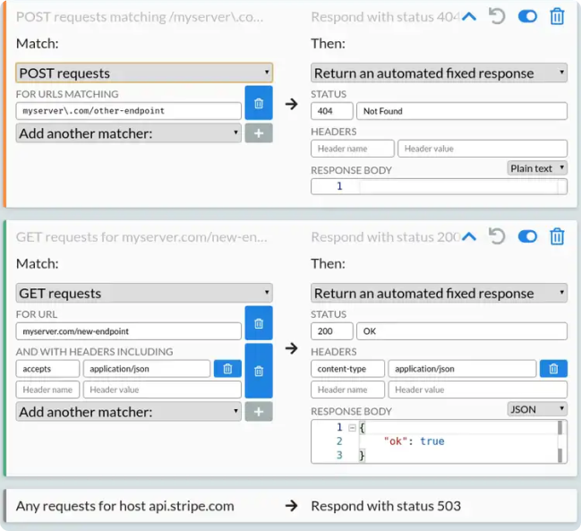 Create rules to match requests and respond with your own content, to quickly prototype against new endpoints or services.